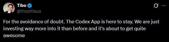Tibo clarified concerns in a post on X, confirming that OpenAI had no plans to shut down Codex. He wrote, “For the avoidance of doubt. The Codex App is here to stay.” The Codex chief teased that users can expect a lot more from the app soon. Sottiaux added, “We are just investing way more into it than before and it’s about to get quite awesome.”