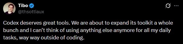 Tibo reckoned that in the future Codex might do all your daily tasks. He explained, “We are about to expand its toolkit a whole bunch and I can’t think of using anything else anymore for all my daily tasks, way way outside of coding.”