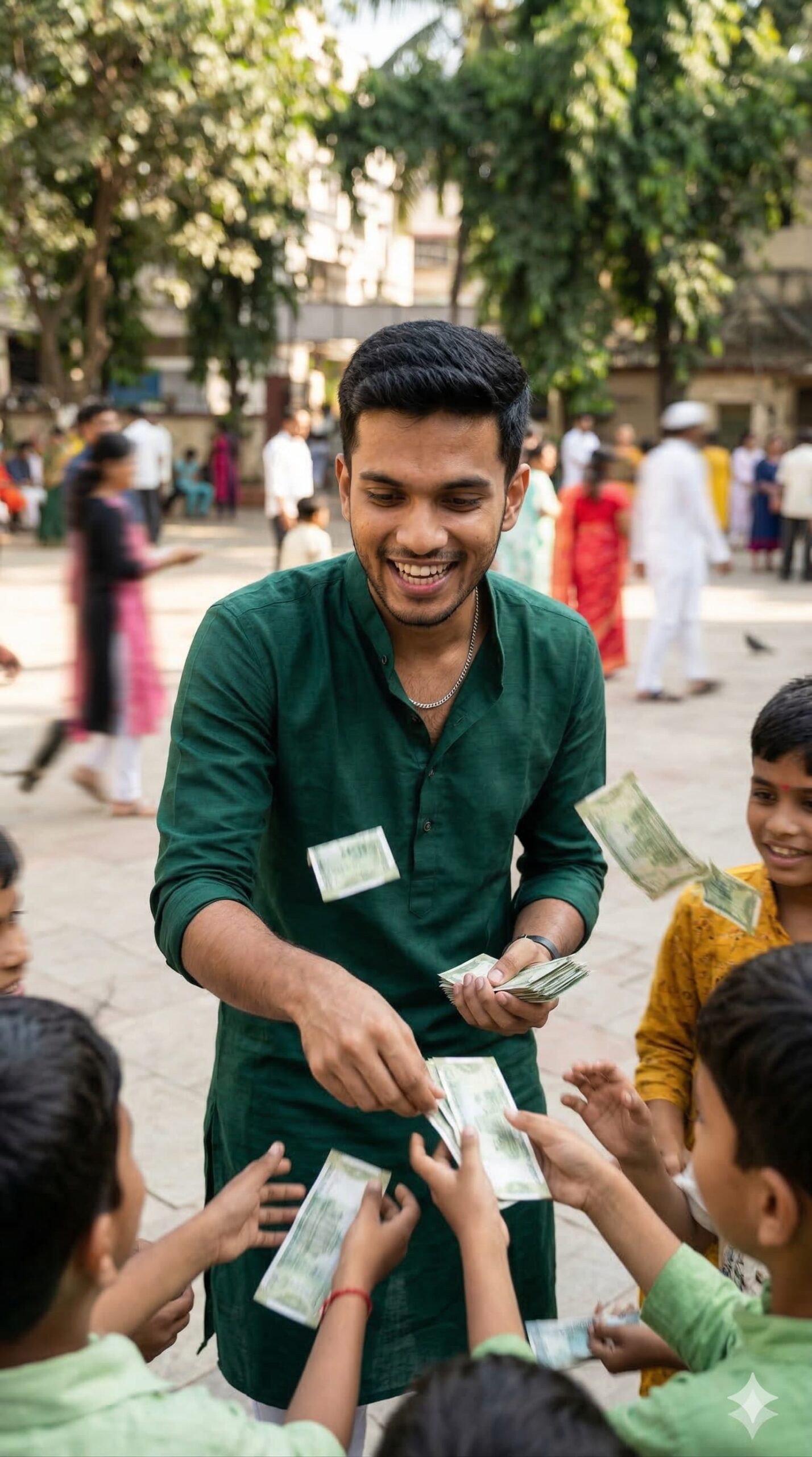 An action-focused, low-angle shot of the subject joyfully handing out crisp green Eidi (cash) to a blur of excited children rushing past the camera. The subject is crouching slightly, wearing a tailored deep emerald kurta. Fast shutter speed freezes the motion of the money and the children’s dynamic movement.
