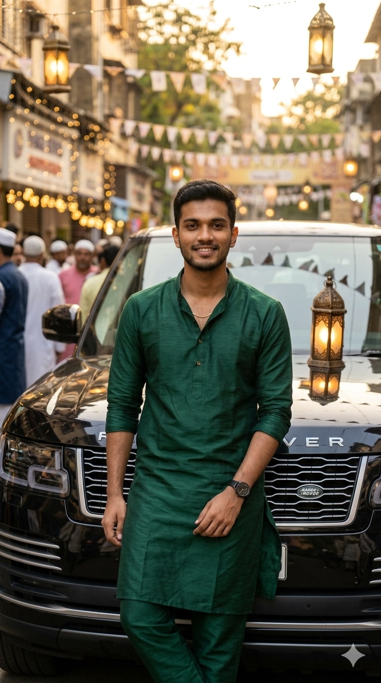 An ultra-premium automotive lifestyle portrait. The subject leans confidently against the glossy black hood of a luxury Range Rover, which is parked on a beautifully decorated Eid street. He wears a deep emerald kurta and pyjama. The scene has soft, cinematic morning lighting with glowing lantern illumination reflecting on the car surface.