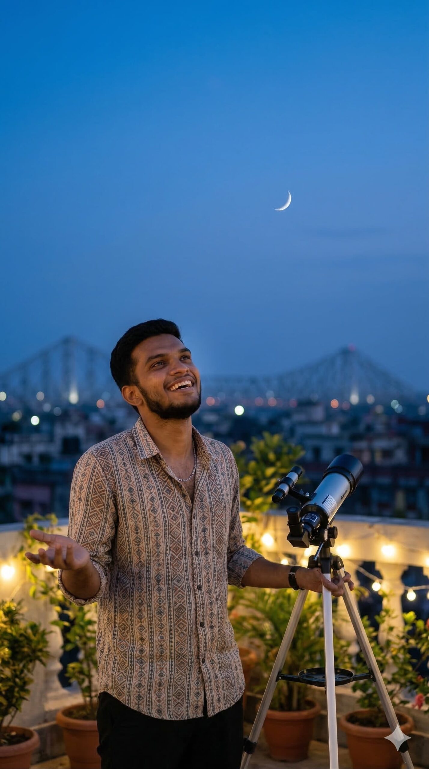 A high-resolution candid portrait captured on a decorated terrace in Kolkata overlooking the city skyline at dusk. The subject is standing by a small telescope, looking out at the night sky with a patient, joyful expression and a gentle shrug. A small, thin silver crescent moon is visible in the dark blue sky.