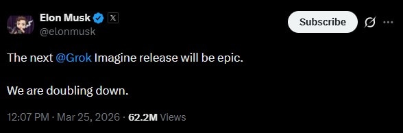 On X, Elon Musk wrote that xAI, now merged with SpaceX, was going to leave no stone unturned for the next version. He wrote, “The next @Grok Imagine release will be epic. We are doubling down.”