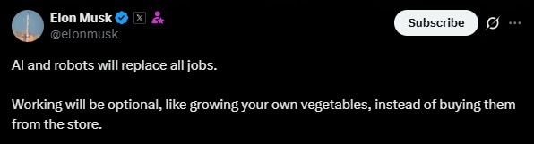 Rather than painting a dystopian picture, Musk presented this as an opportunity for humanity. He stated, “Working will be optional, like growing your own vegetables, instead of buying them from the store.”