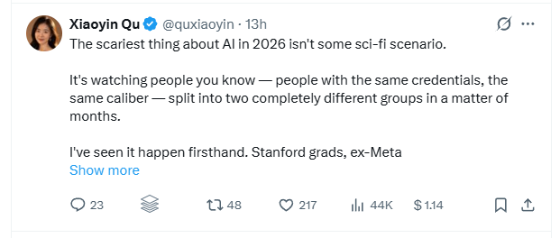 “The scariest thing about AI in 2026 isn’t some sci-fi scenario,” Qu wrote. “It’s watching people you know — people with the same credentials, the same caliber — split into two completely different groups in a matter of months.”
