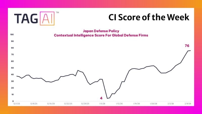 As the graphical illustration suggests, TAG AI’s Contextual Intelligence Score detected a shift in geopolitical dynamics following Japanese Prime Minister Sanae Takaichi’s historic election win, signalling improved prospects for global defence firms. As her victory became likely, the score rose reflecting an increased confidence in a more assertive defence posture — including higher spending and modernisation. It is important to note that the score had dropped and even signalled a risk a few weeks back after an earlier policy action by China over export controls on rare-earth minerals.