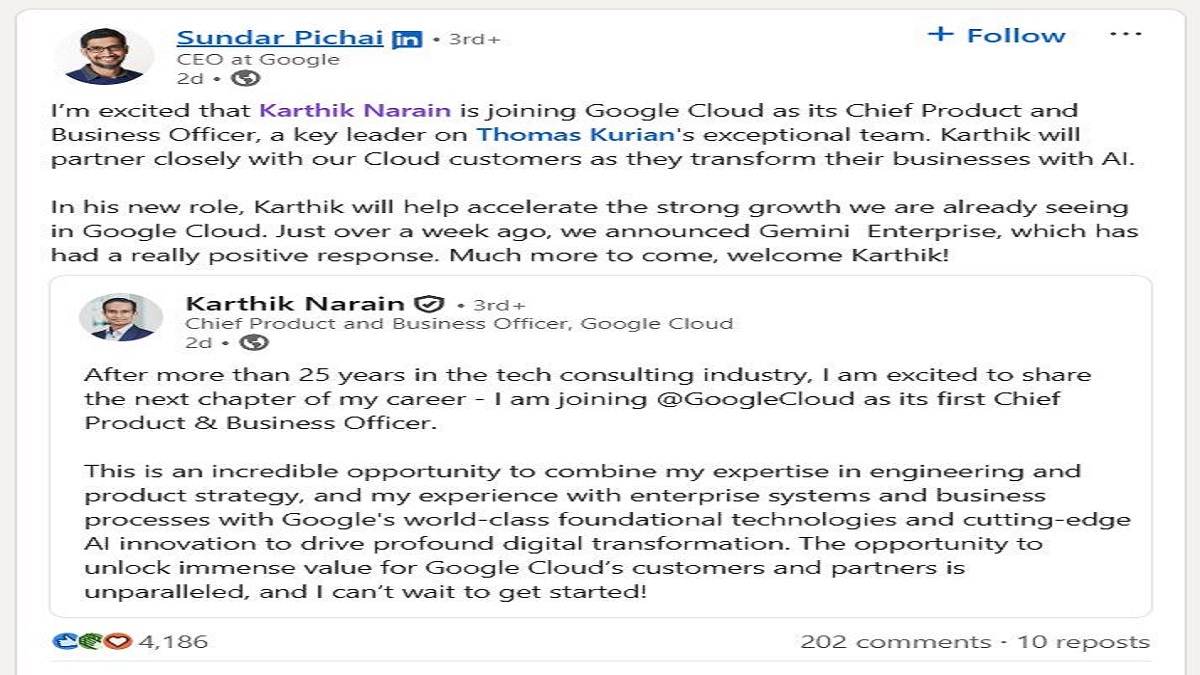 Google CEO Sundar Pichai has announced the appointment of Karthik Narain as the new Chief Product and Business Officer of Google Cloud. This strategic leadership change aims to accelerate Google Cloud’s growth and customer transformation through artificial intelligence.