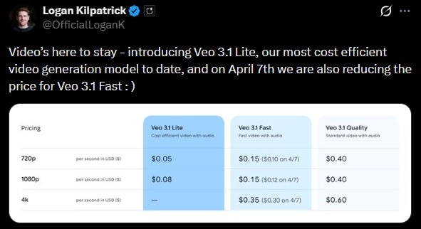 Kilpatrick revealed that Google was now offering a more affordable plan to create videos, called Veo 3.1 Lite. And the company was also reducing the cost of generating videos for the pre-existing Veo 3.1 Fast tier.