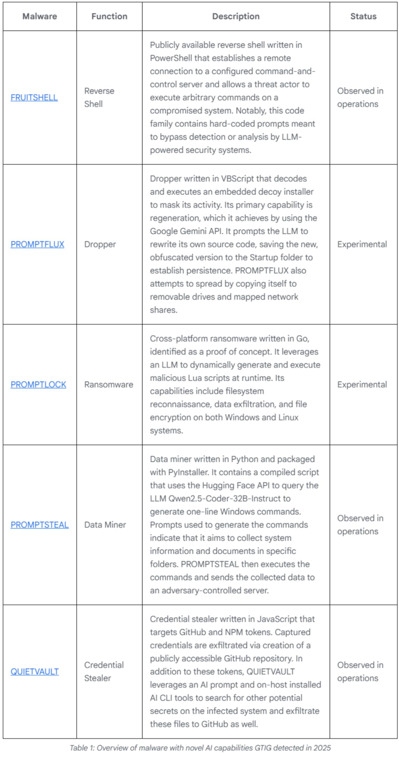 Google identified specific malware strains like PROMPTFLUX and PROMPTSTEAL that use Large Language Models (LLMs). These threats generate new malicious scripts every time they execute.