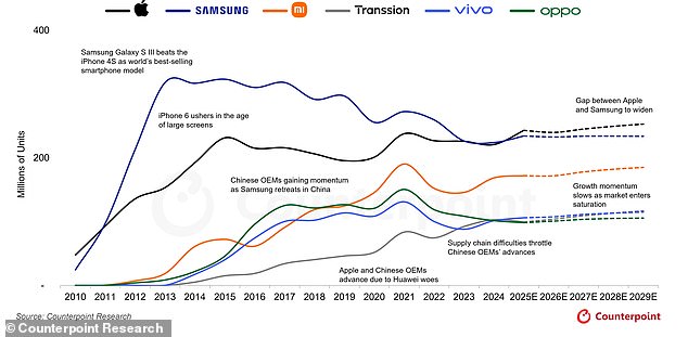 Apple is set to surpass Samsung to become the world’s leading smartphone manufacturer for the first time since 2011, according to Counterpoint Research. The tech giant will ship approximately 243 million phones this year, capturing 19.4% of the global market compared to Samsung’s 235 million shipments and 18.7% share.