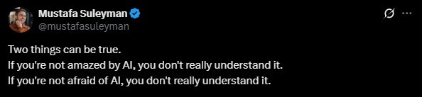 In a series of posts on X (formerly Twitter), Suleyman presented a balanced but concerning perspective. “If you’re not amazed by AI, you don’t really understand it. If you’re not afraid of AI, you don’t really understand it,” he wrote.