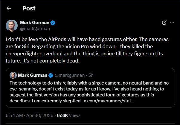 “Regarding the Vision Pro wind down — they killed the cheaper/lighter overhaul and the thing is on ice till they figure out its future. It’s not completely dead,” Mark Gurman wrote in an X post.