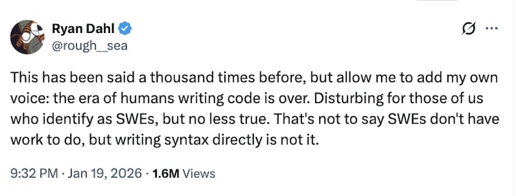 Ryan Dahl, the creator of Node.js, has declared the era of humans writing code is over. He argues the future of software engineering lies in managing AI systems that generate code, not in writing it manually.
