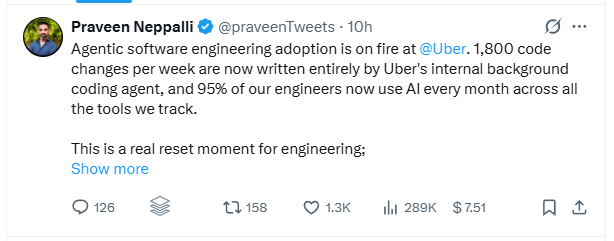 Naga revealed that Uber is now seeing large-scale adoption of what he described as “agentic software engineering.” According to him, around 1,800 code changes every week are being written entirely by the company’s internal AI coding agent, without direct human input in the writing process.