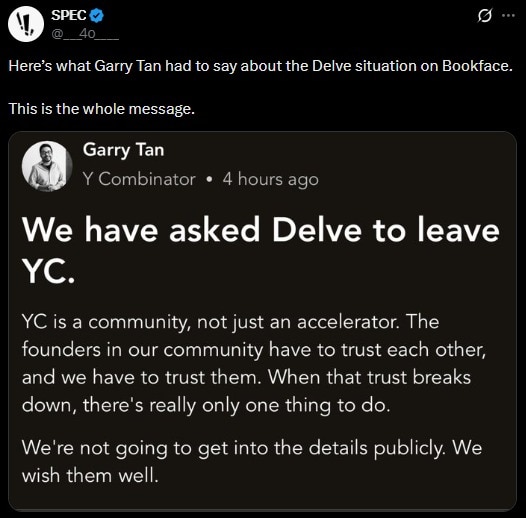 Y Combinator is one of the most prestigious startup accelerators in Silicon Valley. Following the allegations on Delve, Y Combinator President and CEO Garry Tan has stated that the startup was asked to leave the accelerator. He wrote on Bookface, “We have asked Delve to leave YC. YC is a community, not just an accelerator.”