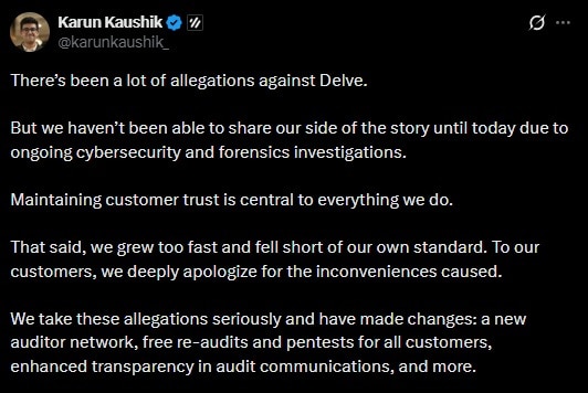 Selin Kocalar ensured existing Delve customers that the company was ready to provide re-audits. She said in the same clip, “We’ve rebuilt our auditor network, offered every single one of our customers complimentary re-audits and pen tests.”