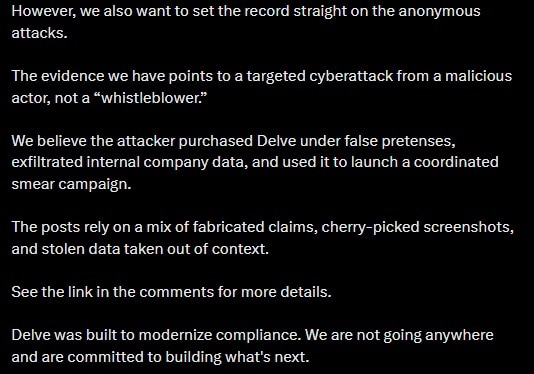 In an accompanying video, he says that after working with independent security firms, Delve was confident that it was a cyberattack. He explained, “The data extracted matches the timestamps and the sources shared in the anonymous posts, and we believe that it is being cherry-picked, misconstrued, and taken out of context to hurt us.”