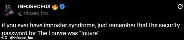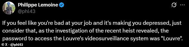 The security revelations sparked widespread ridicule online. One X user commented: “If you feel like you’re bad at your job, just consider that the password to access the Louvre’s video surveillance system was ‘Louvre’.”