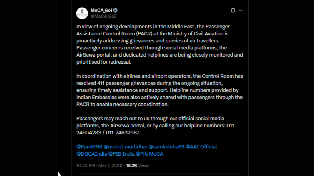 As tensions continue to escalate across parts of West Asia, India’s aviation authorities have stepped up efforts to assist affected passengers amid widespread flight disruptions. The Ministry of Civil Aviation said its Passenger Assistance Control Room (PACR) is working round the clock to address grievances and queries from air travellers impacted by the evolving situation.