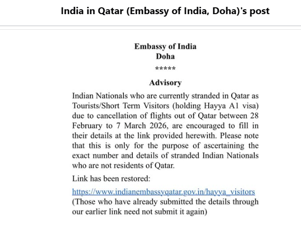 Indian nationals currently stranded in Qatar due to flight disruptions have been urged to submit their details to help authorities assess the number of affected travellers. The advisory applies to Indian tourists and short-term visitors holding the Hayya A1 visa, whose flights out of the country were cancelled between February 28 and March 7, 2026.