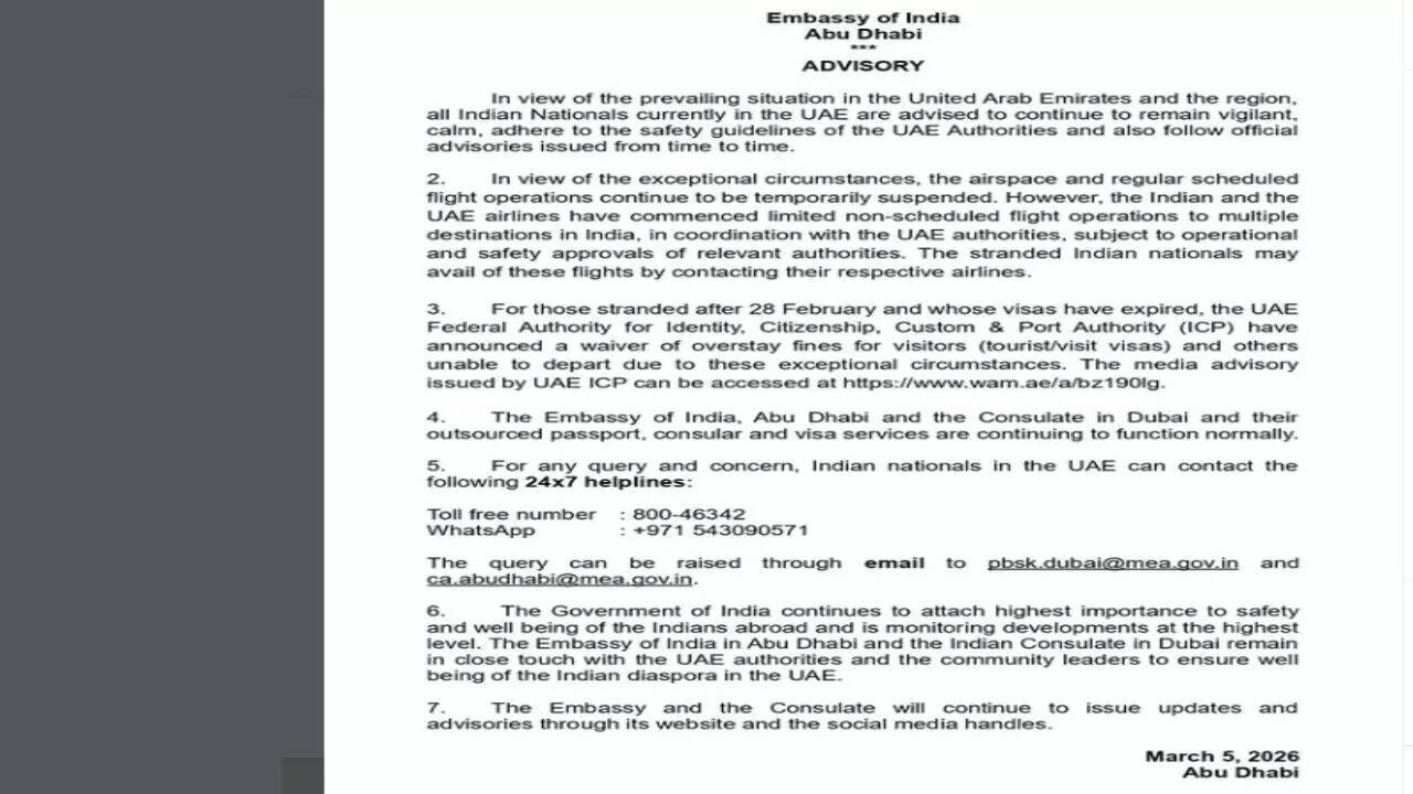 The Embassy of India in Abu Dhabi and the Consulate General of India in Dubai continue to function normally. For emergencies, Indian nationals can contact the embassy’s toll-free helpline (800-46342), WhatsApp support number, or designated email addresses for assistance.