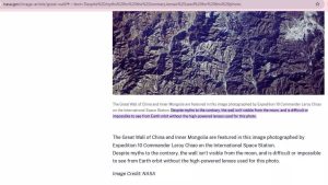 Chinese astronaut Yang Liwei, the country’s first person in space, publicly stated in 2003 that he could not see the Wall from orbit. NASA astronauts have echoed similar observations. According to NASA, while certain human-made structures can be seen from low Earth orbit under ideal conditions, the Great Wall is not easily distinguishable without visual aid.