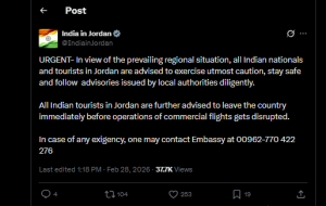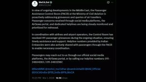 The Ministry of Civil Aviation (@MoCA_GoI) on X released a statement on March 1, 2026, 10:23 PM, that reads, “In view of ongoing developments in the Middle East, the Passenger Assistance Control Room (PACR) at the Ministry of Civil Aviation is proactively addressing grievances and queries of air travellers. Passenger concerns received through social media platforms, the AirSewa portal, and dedicated helplines are being closely monitored and prioritised for redressal. In coordination with airlines and airport operators, the Control Room has resolved 411 passenger grievances during the ongoing situation, ensuring timely assistance and support. Helpline numbers provided by Indian Embassies were also actively shared with passengers through the PACR to enable necessary coordination. Passengers may reach out to us through our official social media platforms, the AirSewa portal, or by calling our helpline numbers: 011-24604283 / 011-24632987.”