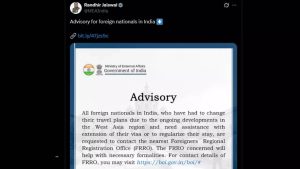 The official advisory reads, “All foreign nationals in India, who have had to change their travel plans due to the ongoing developments in the West Asia region and need assistance with extension of their visa or to regularize their stay, are requested to contact the nearest Foreigners Regional Registration Office (FRRO). The FRRO concerned will help with necessary formalities. For contact details of FRRO, you may visit https://boi.gov.in/boi/”