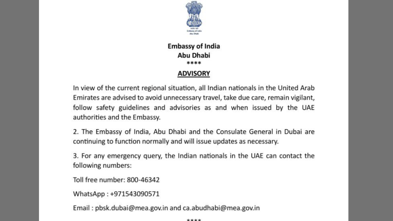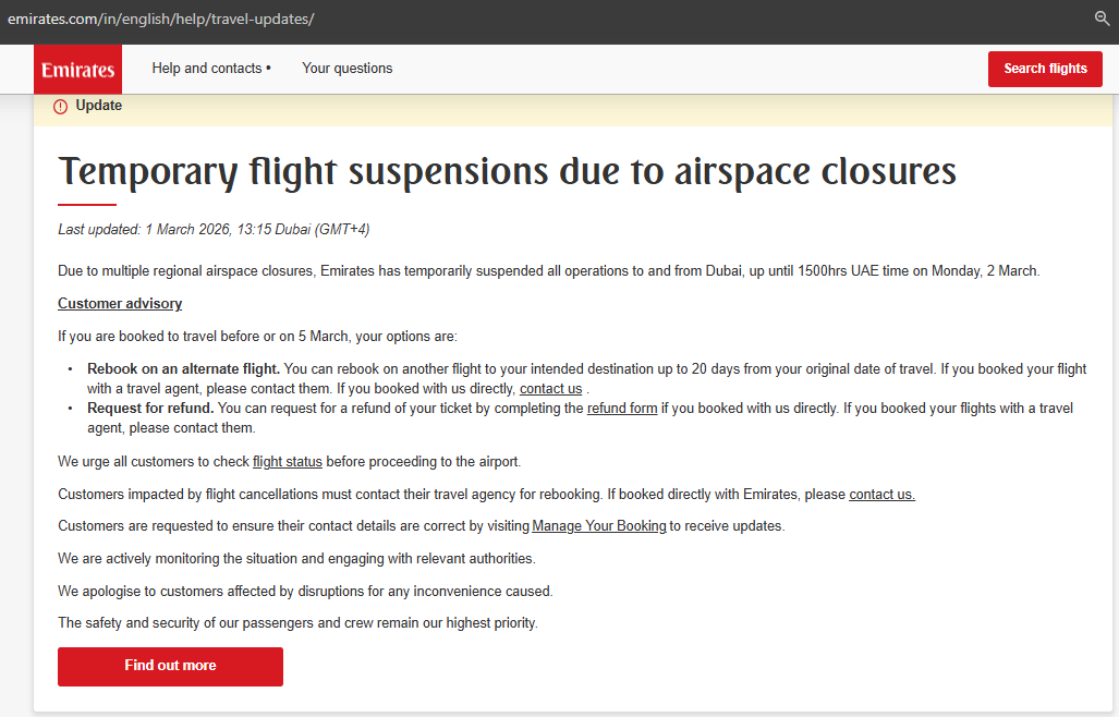 The Ministry of Civil Aviation (@MoCA_GoI) on X released a statement on March 1, 2026, 10:23 PM, that reads, “In view of ongoing developments in the Middle East, the Passenger Assistance Control Room (PACR) at the Ministry of Civil Aviation is proactively addressing grievances and queries of air travellers. Passenger concerns received through social media platforms, the AirSewa portal, and dedicated helplines are being closely monitored and prioritised for redressal. In coordination with airlines and airport operators, the Control Room has resolved 411 passenger grievances during the ongoing situation, ensuring timely assistance and support. Helpline numbers provided by Indian Embassies were also actively shared with passengers through the PACR to enable necessary coordination. Passengers may reach out to us through our official social media platforms, the AirSewa portal, or by calling our helpline numbers: 011-24604283 / 011-24632987.”