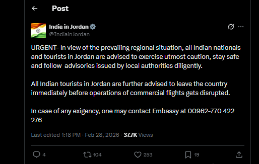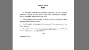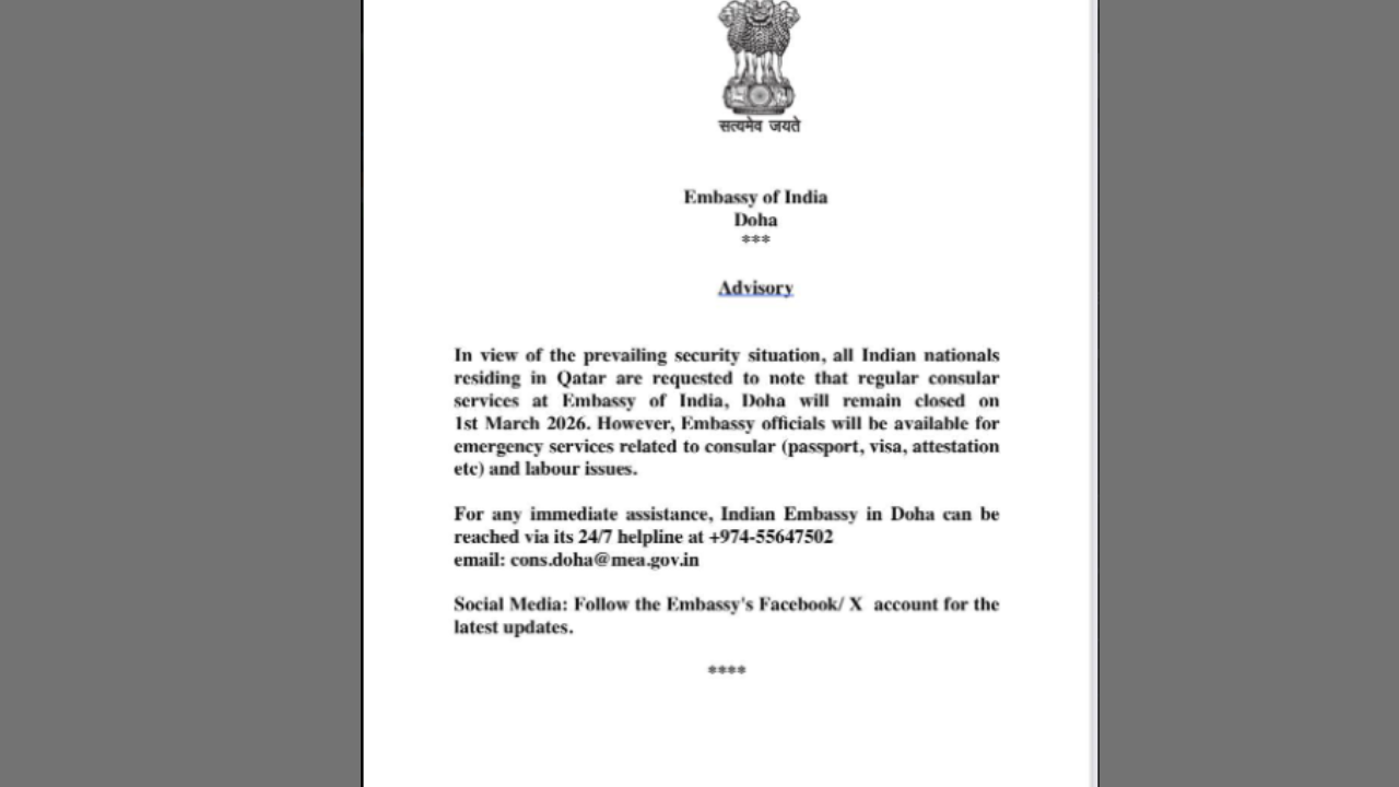 The Embassy of India in Doha shared, “In view of the prevailing situation, all Indian nationals residing in Qatar are requested to note that regular consular services at Embassy of India, Doha, will remai closed on 1st March 2026. However, Embassy officials will be available for emergency services related to consular (passport, visa, attestation etc) and labour issues.” Its 24×7 helpline number is 00974-55647502 and queries can be sent to cons.doha@mea.gov.in.