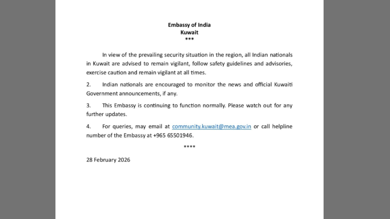 The Embassy of India in Kuwait has advised Indian nationals to exercise caution and remain vigilant at all times, while monitoring news and official Kuwaiti government announcements. For emergencies, they can contact community.kuwait@mea.gov.in or call +96565501946.