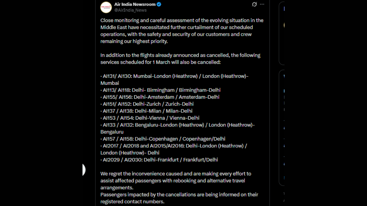 Air India has cancelled a series of long-haul international flights scheduled for March 1, 2026, citing its ongoing assessment of the evolving situati.