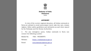 In Syria, the Embassy of India in Damascus has urged Indian nationals to avoid unnecessary travel and remain vigilant. For emergencies, they can contact +963-993385973, visit eoidamascus.gov.in, or email cons.damascus@mea.gov.in.
