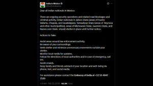 In a post on X, on Monday (February 23, 2026), the embassy shared, “Dear all Indian nationals in Mexico: There are ongoing security operations and related road blockages and criminal activity, Indian nationals in Jalisco State (areas of Puerto Vallarta, Chapala, and Guadalajara), Tamaulipas State (areas of Reynosa and other municipalities), areas of Michoacan State, Guerrero State, and Nuevo Leon State should shelter in place until further notice.