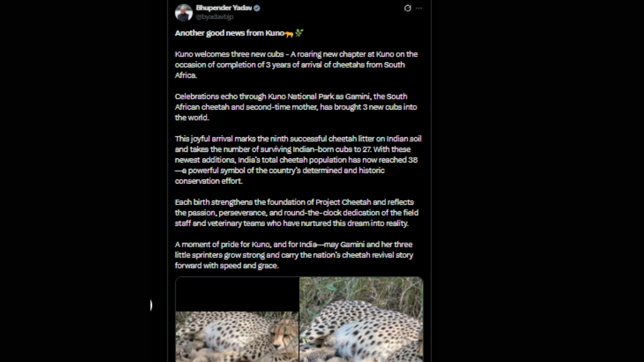 In his social media post on X, Minister Yadav described the moment as “a moment of pride for Kuno, and for India,” expressing hope that Gamini and her cubs will grow strong and carry forward the country’s cheetah revival story.