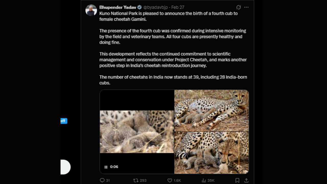 Sharing the update on X, the minister shared, “Kuno National Park is pleased to announce the birth of a fourth cub to female cheetah Gamini. The presence of the fourth cub was confirmed during intensive monitoring by the field and veterinary teams. All four cubs are presently healthy and doing fine. This development reflects the continued commitment to scientific management and conservation under Project Cheetah, and marks another positive step in India’s cheetah reintroduction journey. The number of cheetahs in India now stands at 39, including 28 India-born cubs.”