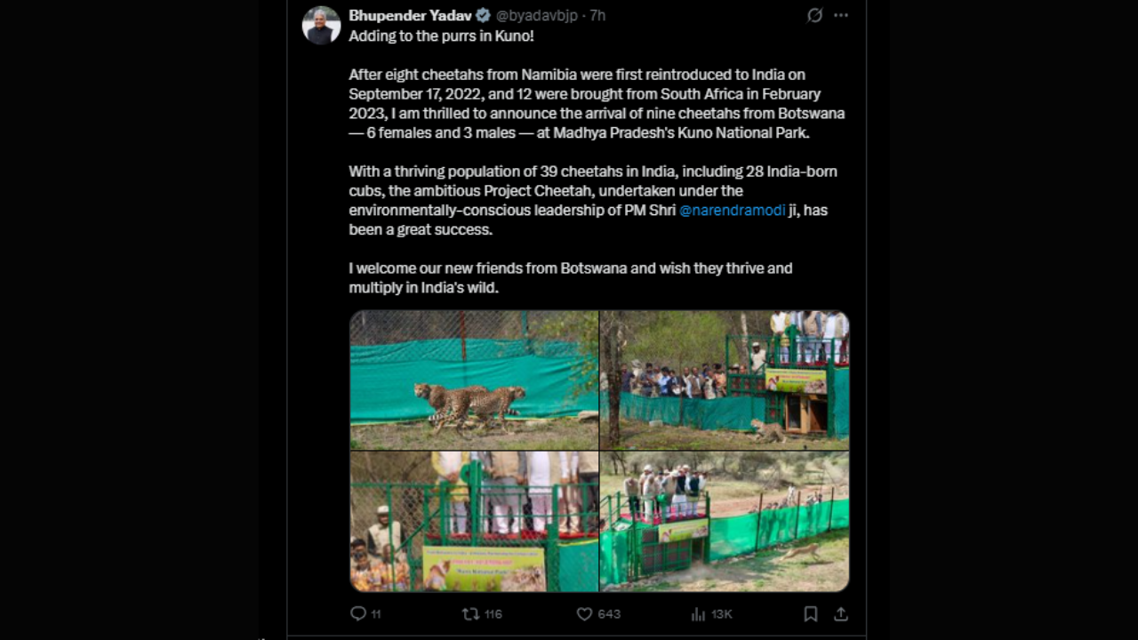 The Minister also shared, “Adding to the purrs in Kuno! After eight cheetahs from Namibia were first reintroduced to India on September 17, 2022, and 12 were brought from South Africa in February 2023, I am thrilled to announce the arrival of nine cheetahs from Botswana — 6 females and 3 males — at Madhya Pradesh’s Kuno National Park. With a thriving population of 39 cheetahs in India, including 28 India-born cubs, the ambitious Project Cheetah, undertaken under the environmentally-conscious leadership of PM Shri @narendramodi ji, has been a great success. I welcome our new friends from Botswana and wish they thrive and multiply in India’s wild.”