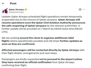 It further reads, “We are working around the clock to organise additional relief flights where operationally possible and will share further updates as soon as they are confirmed. Affected passengers will be contacted directly by Qatar Airways with their flight details, arrangements and next steps. Passengers are kindly requested not to proceed to the airport unless they have received an official notification from Qatar Airways confirming their flight.”