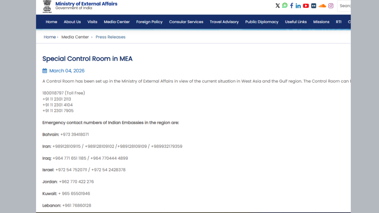 Amid the evolving situation in West Asia and the Gulf region, India’s Ministry of External Affairs (MEA) has set up a special control room to assist Indian nationals who may be affected by the ongoing crisis and travel disruptions. In a press release issued on March 4, 2026, the Ministry said the control room will function daily from 9 am to 9 pm and can be contacted through dedicated helpline numbers.