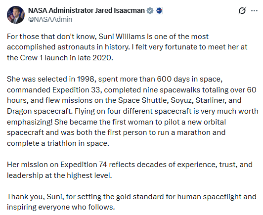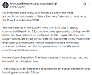 NASA Administrator Bill Nelson celebrated her legacy on social media. “Sunita Williams has been a trailblazer for women in space exploration,” he posted on X. “Her record-breaking career has inspired countless young people to pursue careers in science and engineering.”