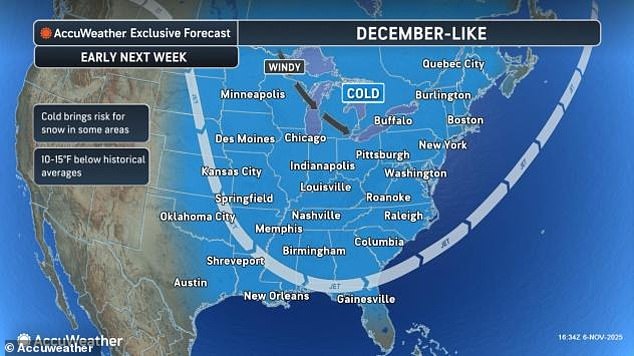 This December-like cold is being driven by a major dip in the jet stream, funneling unusually cold air far south. The northern Plains and Upper Midwest will feel the first wave starting Saturday, with Minneapolis temperatures falling sharply from the 40s to upper 30s.
