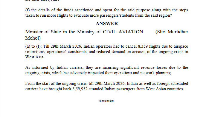 “Till 29th March 2026, Indian operators had to cancel 8,359 flights due to airspace restrictions, operational constraints, and reduced demand on account of the ongoing crisis in West Asia,” the minister said in response.