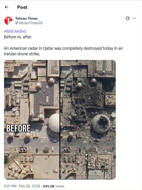 Amid the conflict, Iran’s newspaper Tehran Times made a post on social media platform X, showing damage caused to an American radar system in Qatar during an Iranian drone strike.