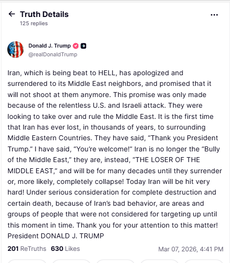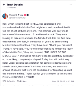 “Iran, which is being beat to HELL, has apologized and surrendered to its Middle East neighbors, and promised that it will not shoot at them anymore. This promise was only made because of the relentless US and Israeli attack. They were looking to take over and rule the Middle East. It is the first time that Iran has ever lost, in thousands of years, to surrounding Middle Eastern Countries. They have said, ‘Thank you President Trump.’ I have said, ‘You’re welcome!’,” Trump wrote on Truth Social.