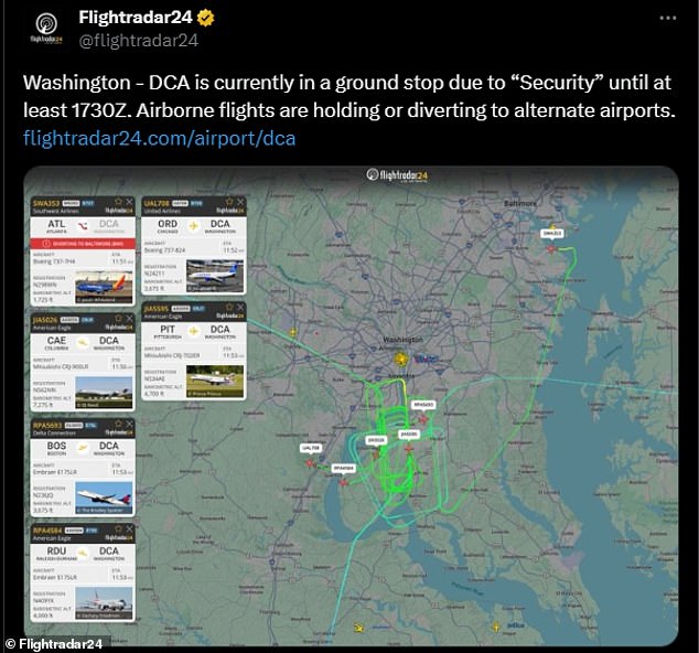 “All flight operations are being held at Reagan National while passengers on a United Airlines flight are being offloaded and bussed to the terminal,” a DCA spokesperson told Daily Mail.