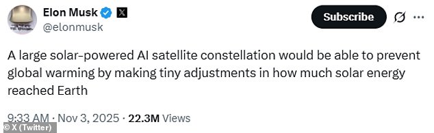 Musk said: ‘A large solar-powered AI satellite constellation would be able to prevent global warming by making tiny adjustments in how much solar energy reached Earth’