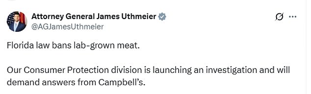 Florida banned lab-grown meat in 2024 to protect traditional agriculture and family farms. Attorney General Uthmeier announced on X that the state’s Consumer Protection division will “demand answers from Campbell’s” about the allegations.