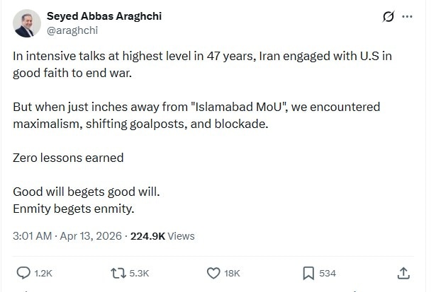 Iran said it came just inches away from sealing an “Islamabad MoU” with the United States before the talks collapsed, with Foreign Minister Abbas Araghchi accusing Washington of last-minute “maximalism, shifting goalposts, and blockade.” In a post on X, Araghchi said Tehran entered the highest-level direct engagement with the US in 47 years in good faith to help end the war, but claimed the negotiations broke down at the final stage when a breakthrough appeared within reach.