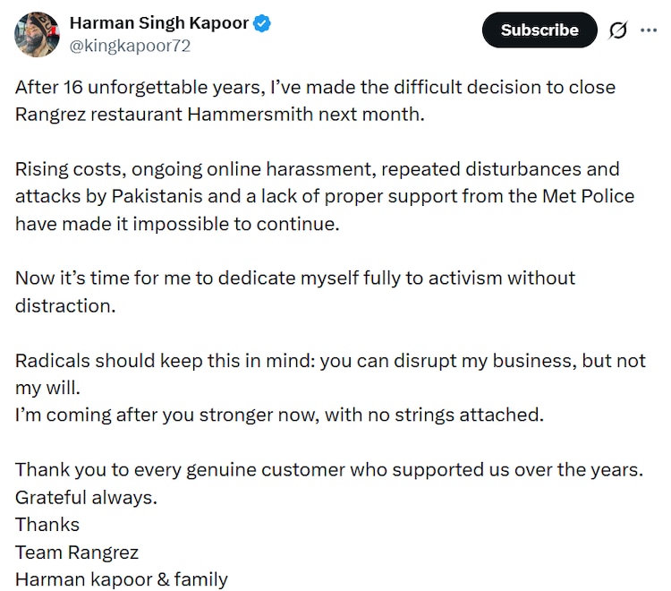 After 16 years of welcoming diners in London, Harman Singh Kapoor has announced he will close his Indian restaurant, Rangrez, next month. He cited spiralling costs, repeated disturbances, alleged attacks by groups he identified as Pakistanis, and what he called inadequate support from the Met Police as reasons for the shutdown.