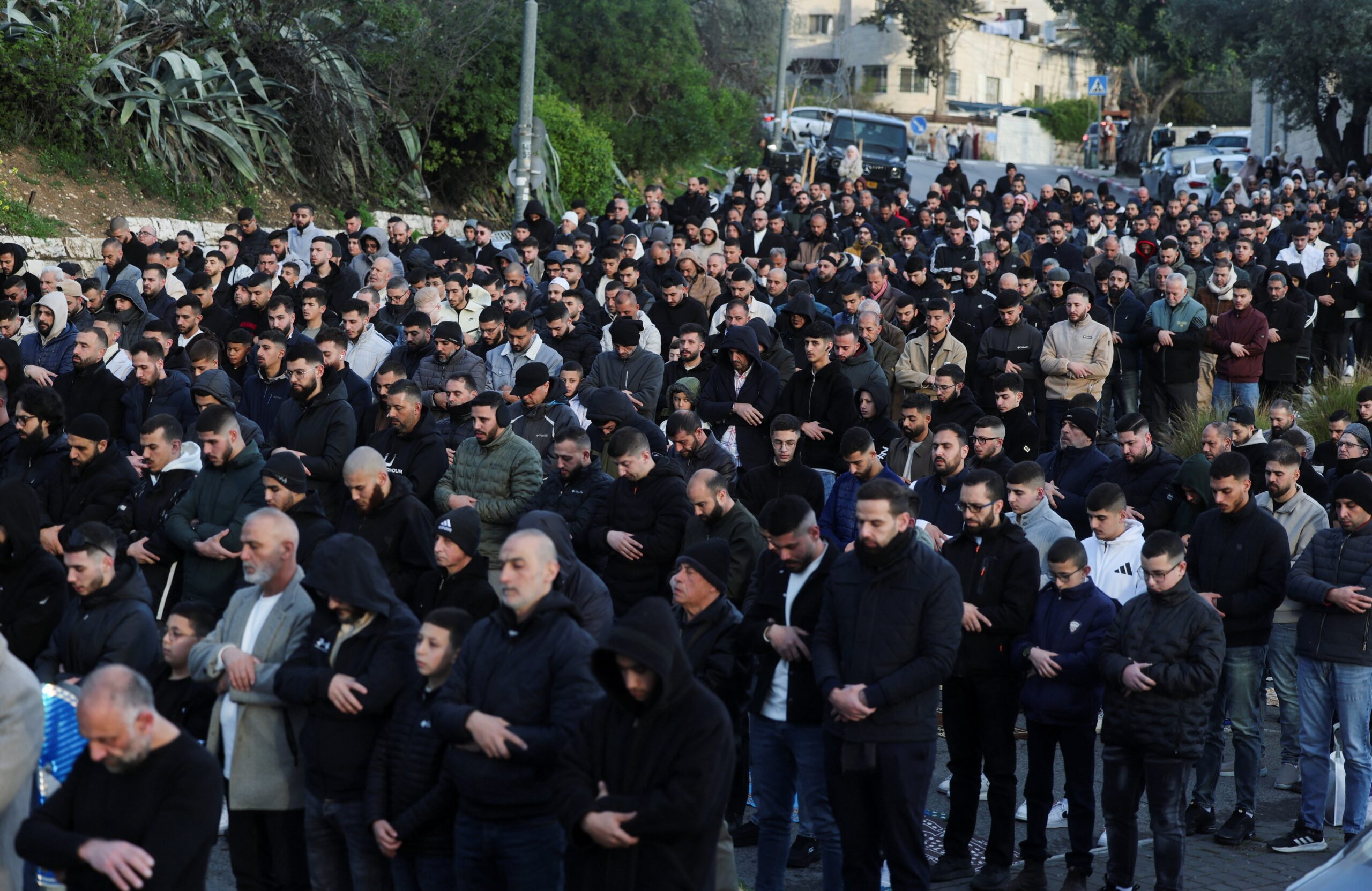 Palestinian Muslim worshippers pray by a road to mark the end of the holy fasting month of Ramadan, as they are not permitted to attend the Eid al-Fitr prayers at Al-Aqsa compound, also known to Jews as the Temple Mount, following restrictions on gathering in large groups, amid the U.S.-Israeli conflict with Iran, in Jerusalem, March 20, 2026. REUTERS/Ammar Awad (REUTERS)