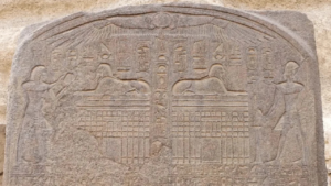 Relevant section of the Dream Stele of Thutmose IV (c. 1400 BCE), showing the “palace facade” beneath the Sphinx. Photo: R.M.S. & Catherine Ulissey (2015).